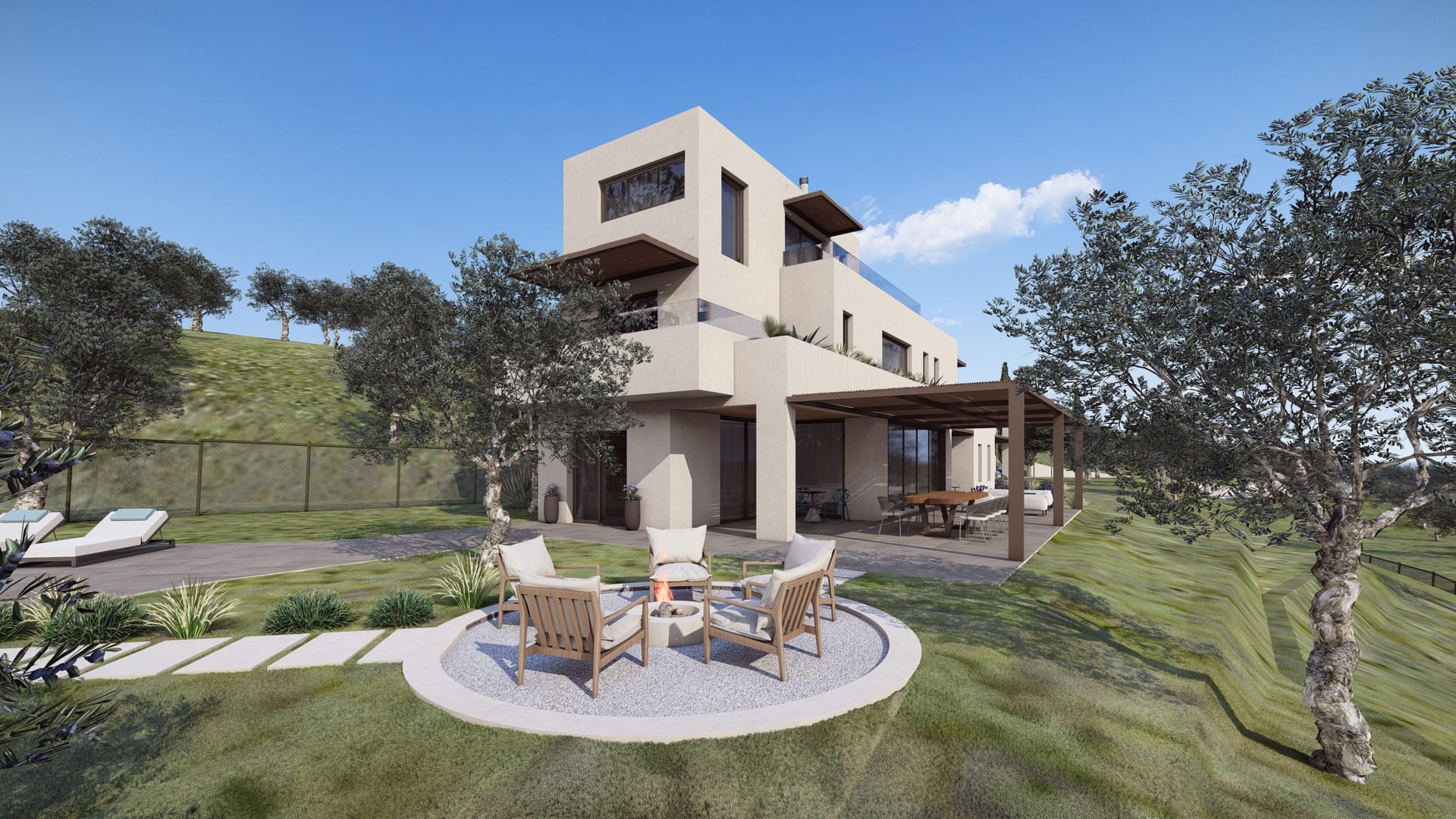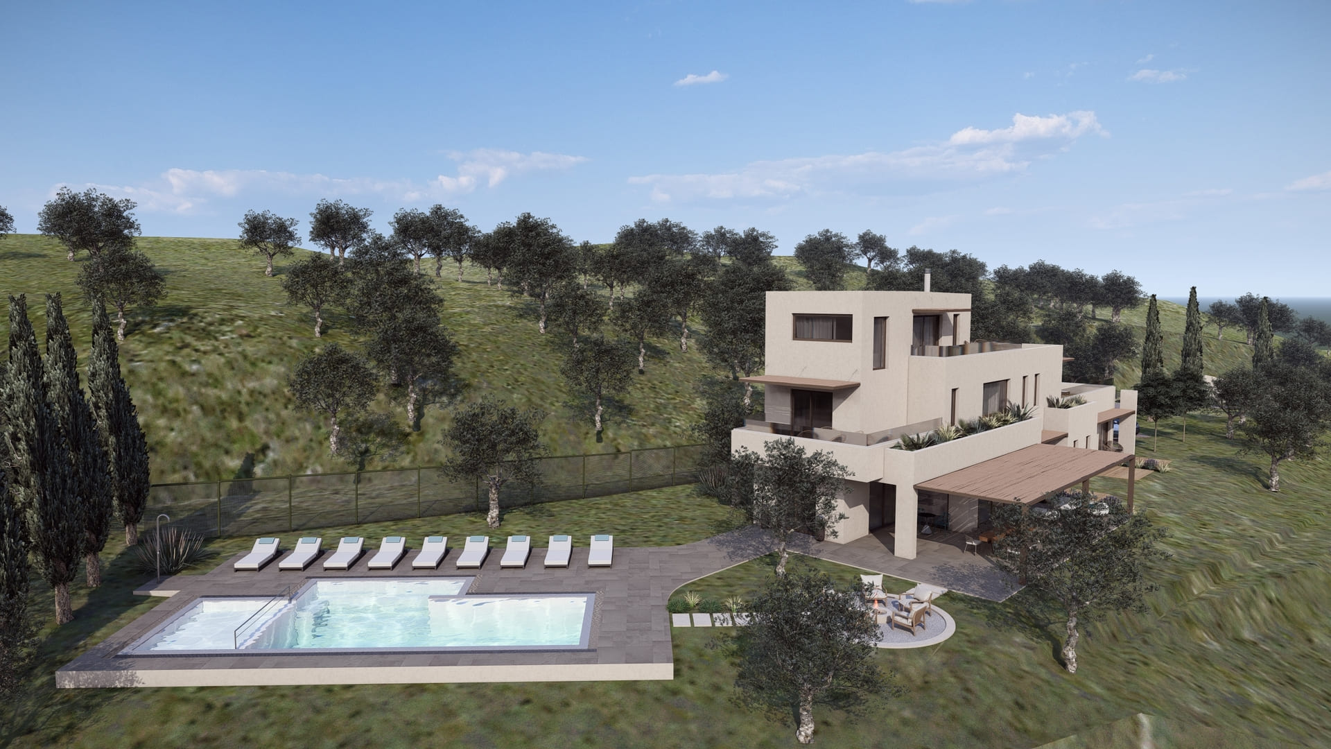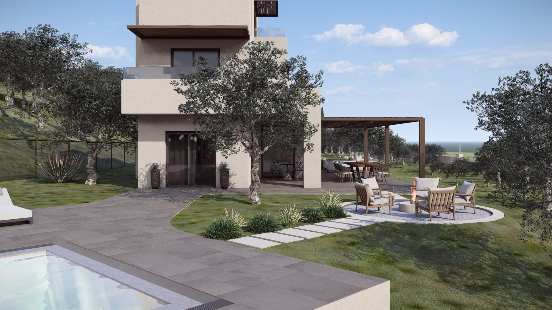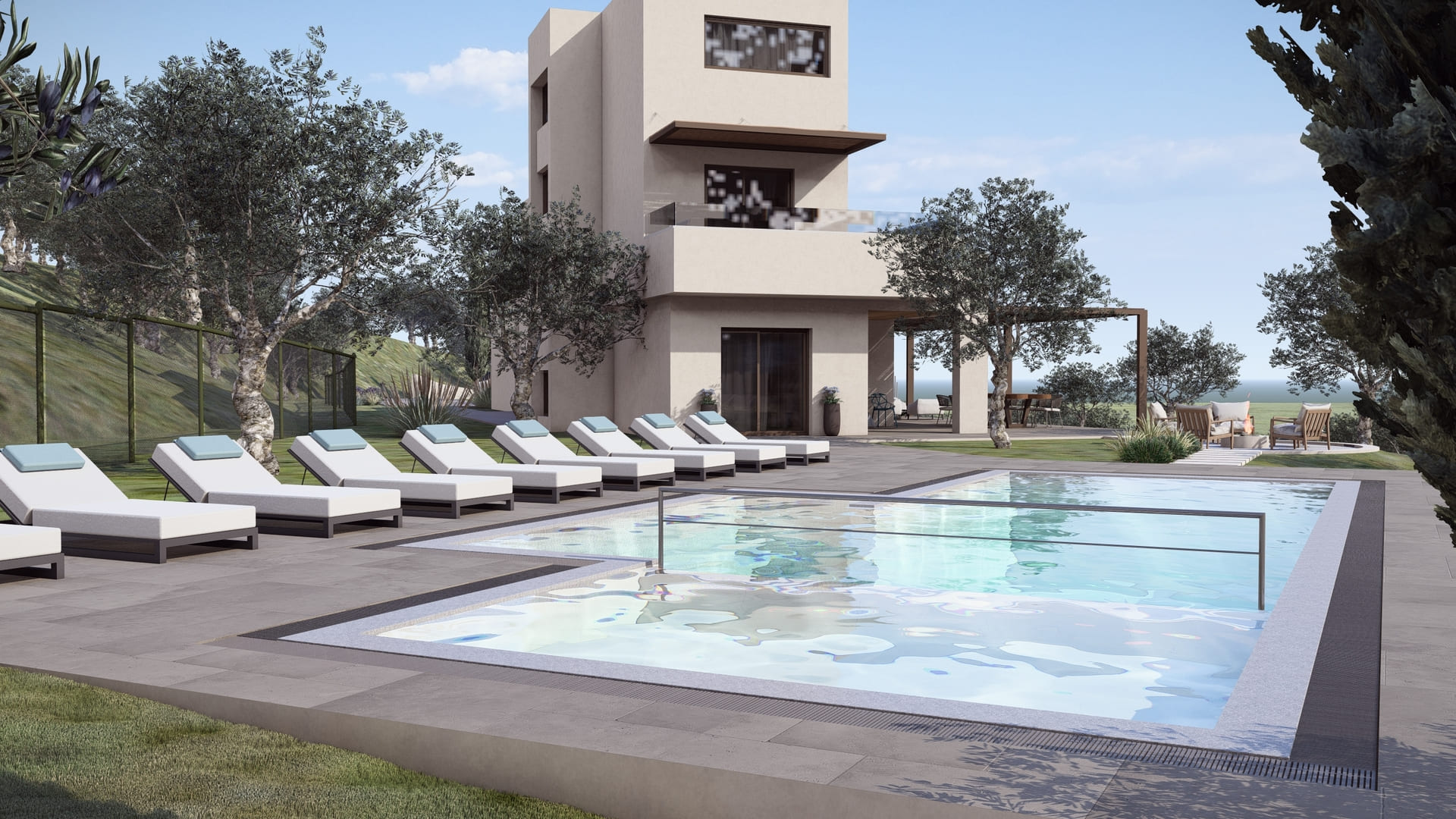 The pool area occupies the northern side of the plot, positioned to receive maximum sunlight and maintain uninterrupted sea views. Surrounded by timber decking, soft landscaping, and shaded sitting areas, it becomes the focal point of leisure and relaxation — a tranquil extension of the villa’s living space into the Mediterranean landscape.