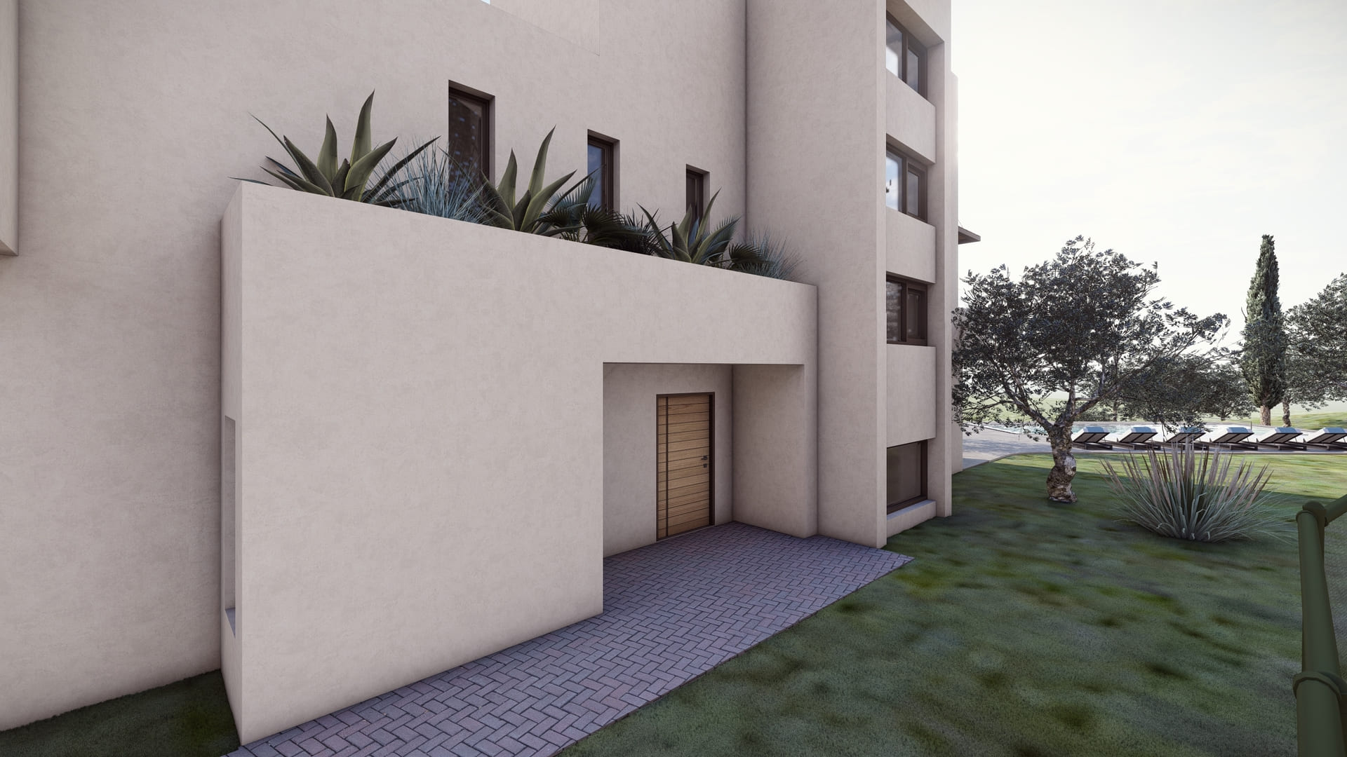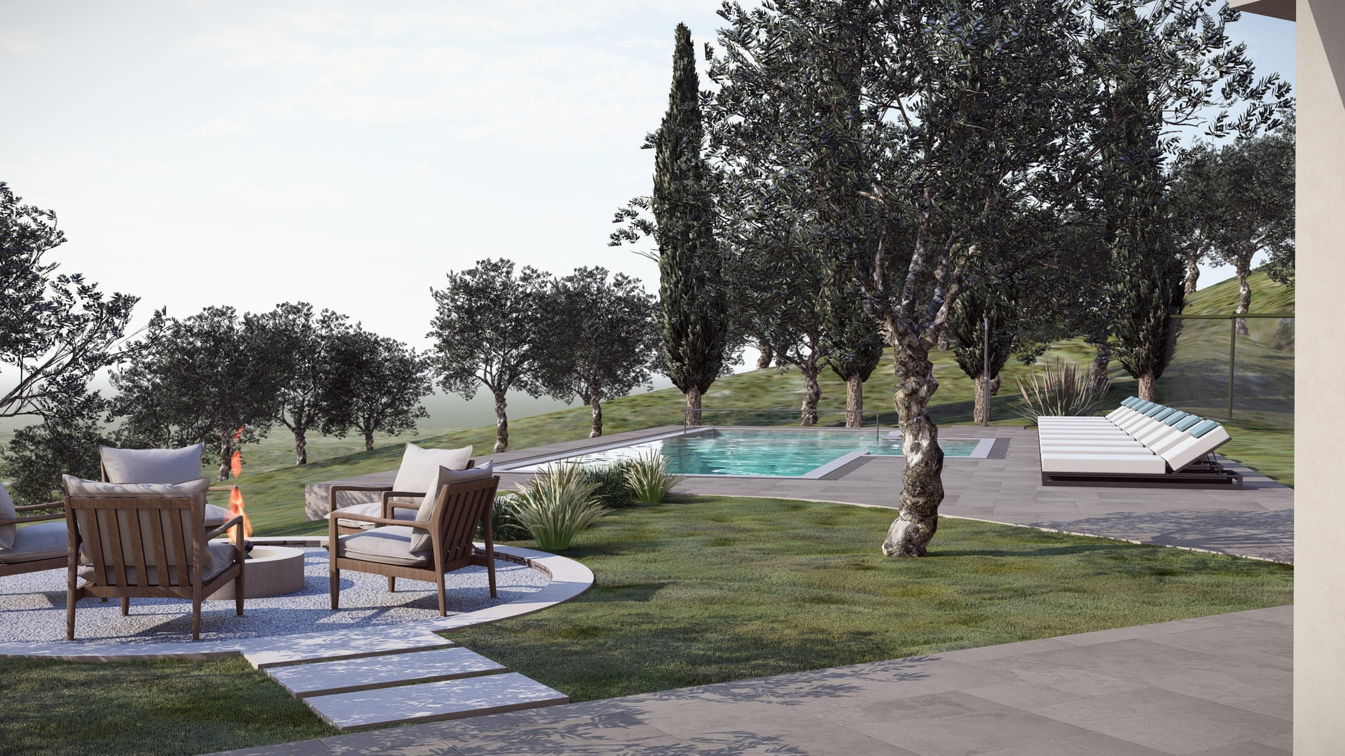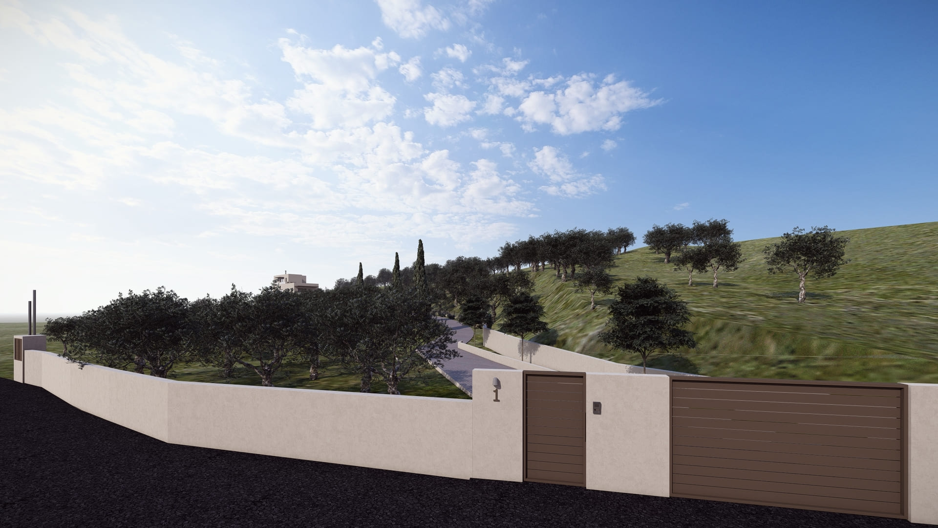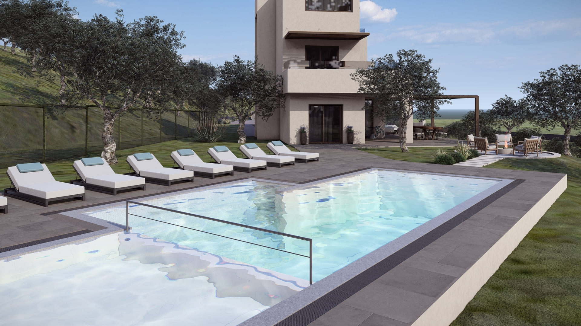 The pool area occupies the northern side of the plot, positioned to receive maximum sunlight and maintain uninterrupted sea views. Surrounded by timber decking, soft landscaping, and shaded sitting areas, it becomes the focal point of leisure and relaxation — a tranquil extension of the villa’s living space into the Mediterranean landscape.