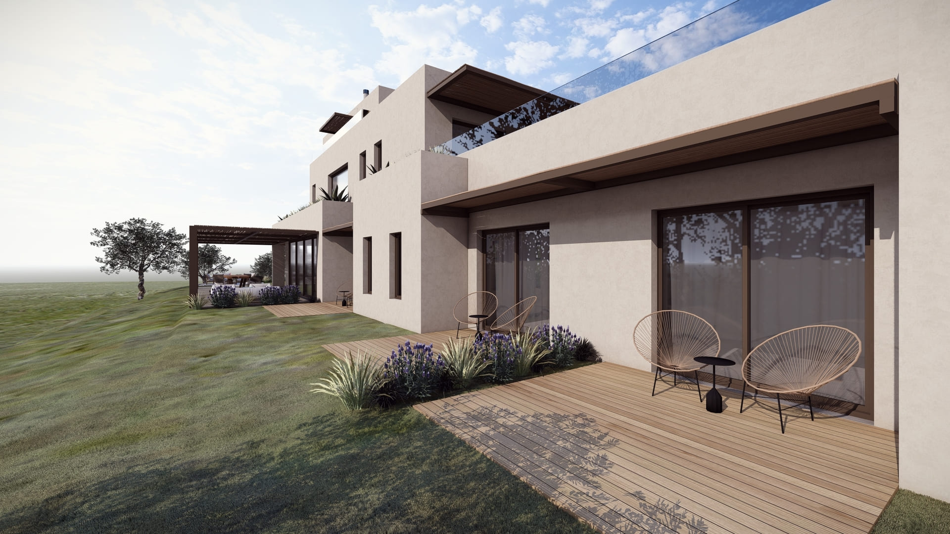 Architecturally, the design is defined by clean volumes and a balanced rhythm of solid and transparent surfaces. The structure is constructed with reinforced concrete and finished with a carefully selected palette of forged cement, natural stone cladding, and light beige plaster. These materials are complemented by brown aluminum pergolas with bamboo shading, introducing texture and warmth while maintaining a modern aesthetic. Large glass openings dissolve the boundary between interior and exterior, allowing natural light to define the atmosphere throughout the day.