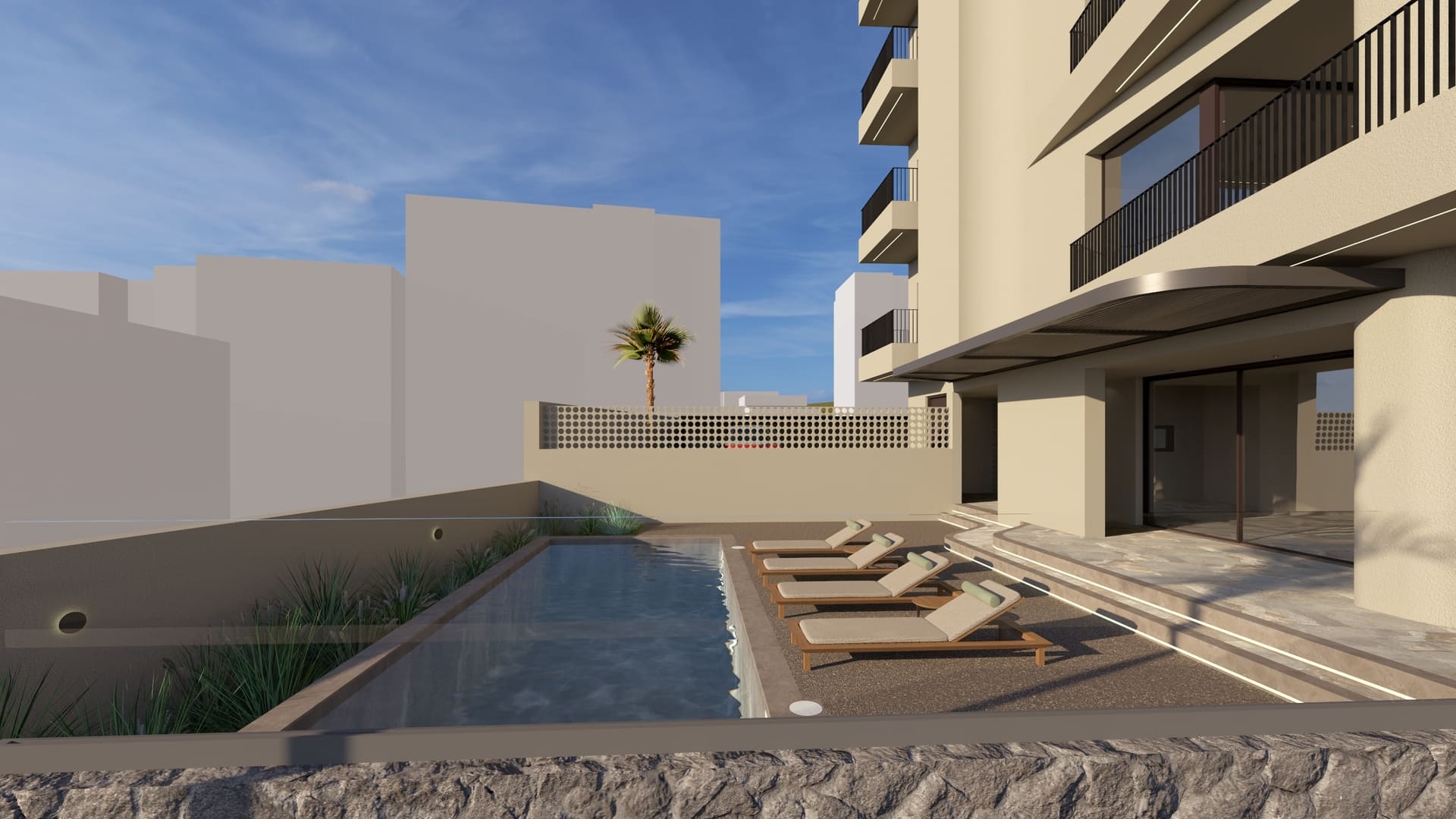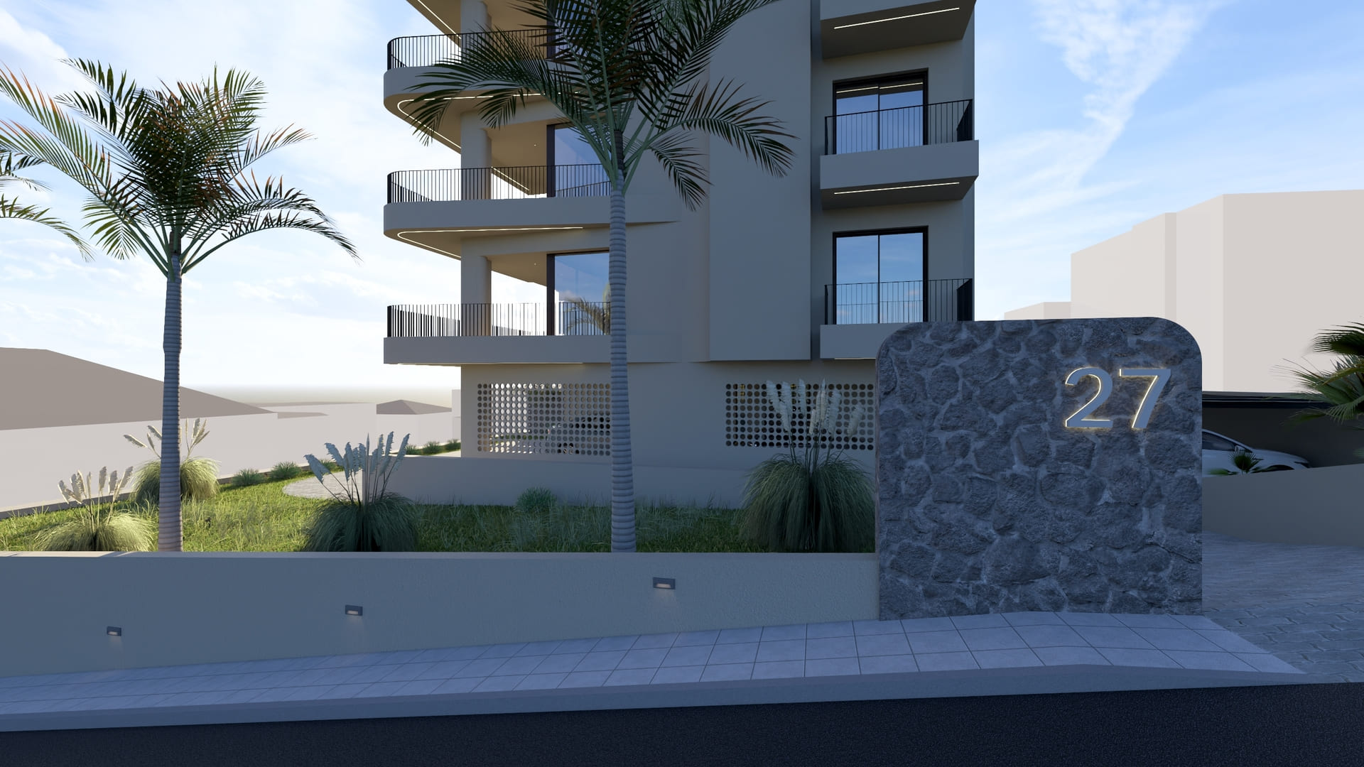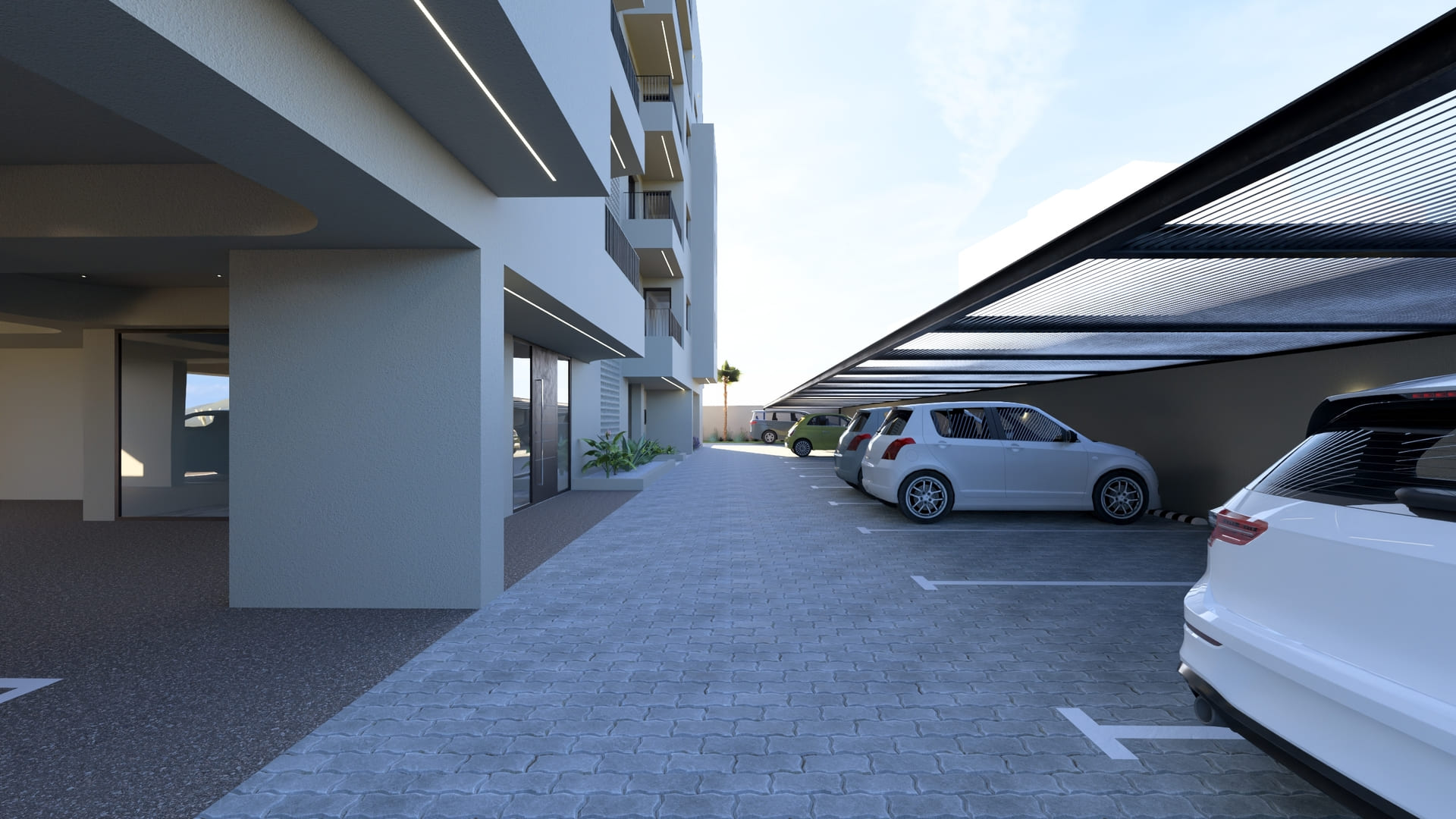 Material choices extend to the outdoor spaces, where perforated paving allows for permeability and green continuity. Stone cladding marks the main entrance and pool area, grounding the building in its Mediterranean setting. The overall design reflects a modern urban residence that combines clarity of form, efficiency, and a refined material palette to create a timeless architectural statement in the heart of Chania.
