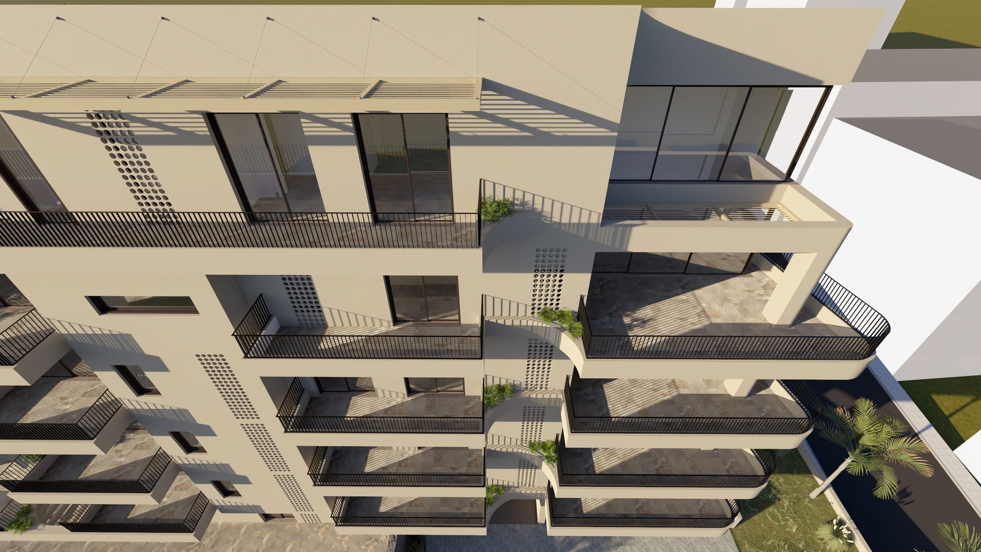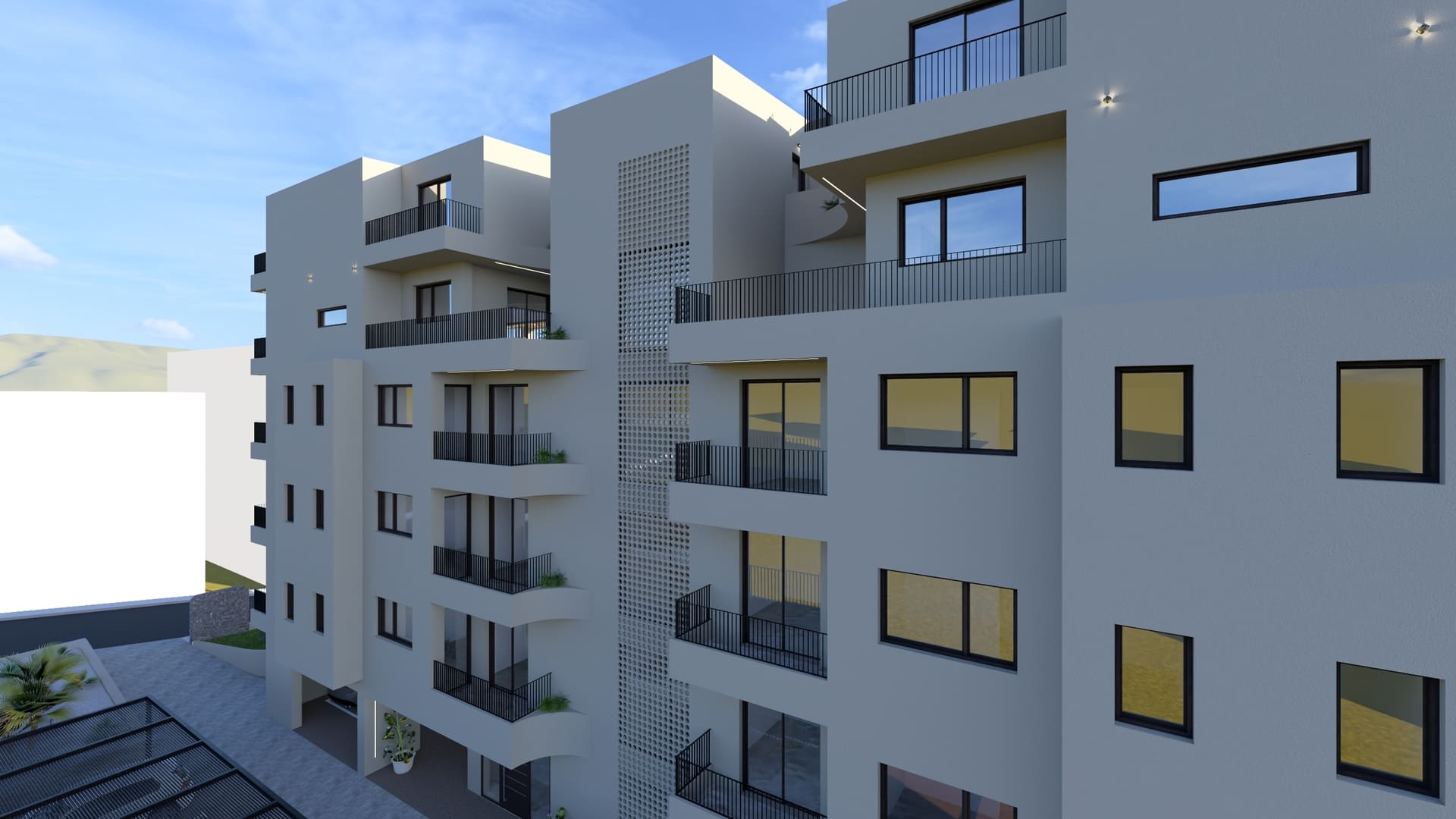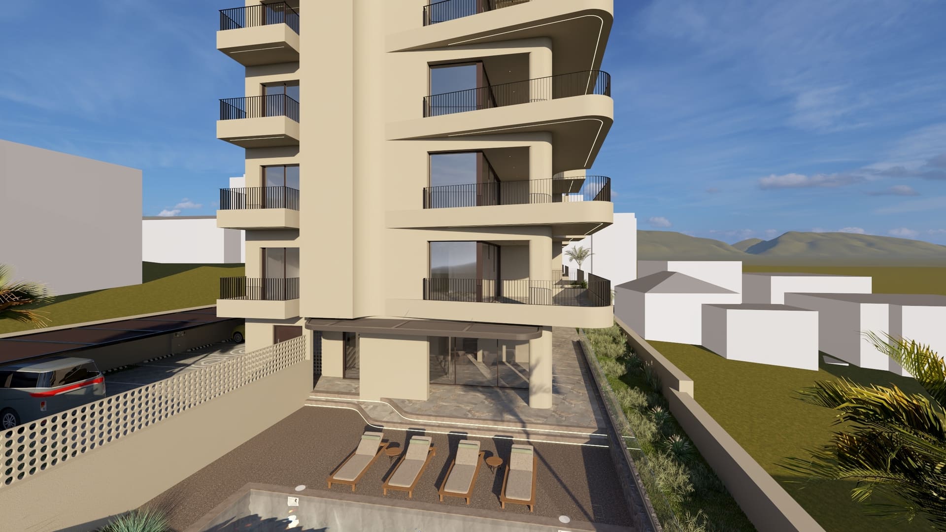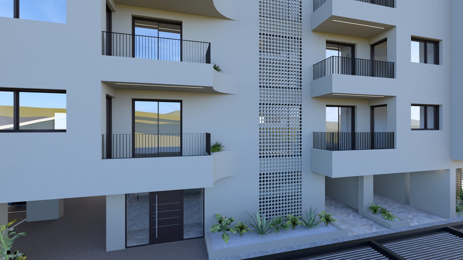 The building is positioned freely within the plot to maximize natural lighting and ventilation, ensuring that all apartments are cross-ventilated. The surrounding landscape is carefully designed to increase green areas and provide 23 parking spaces, addressing a key urban challenge in Chania. Architecturally, the building adopts a monolithic aesthetic with soft sculptural gestures. Curved balconies and projections define the façades, softening the volume and giving it a dynamic yet balanced form. A unified beige tone envelops the structure, complemented by vertical dark-gray metal railings and aluminum frames, emphasizing a restrained and contemporary character. Secondary façades and openings are treated with light screening elements in wood or PVC panels, maintaining privacy and uniformity.