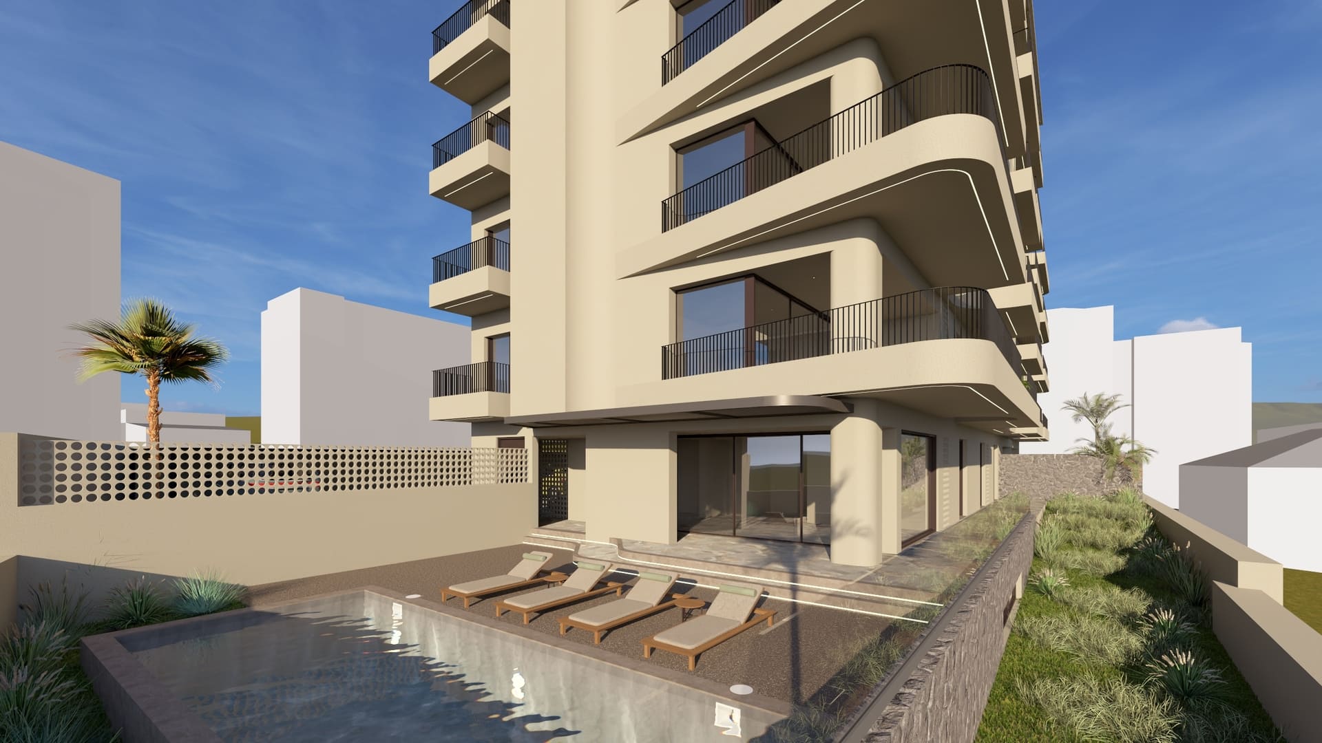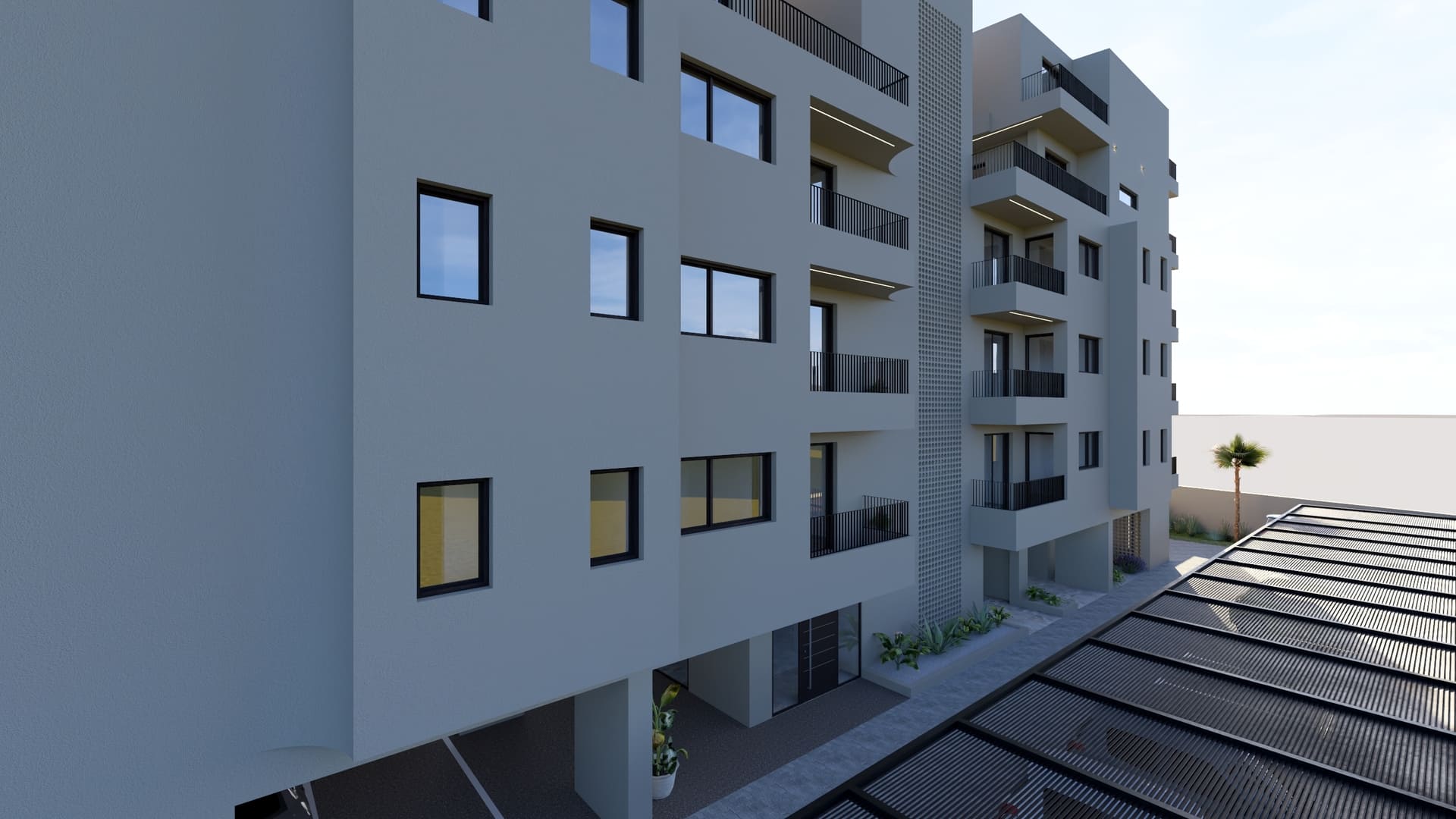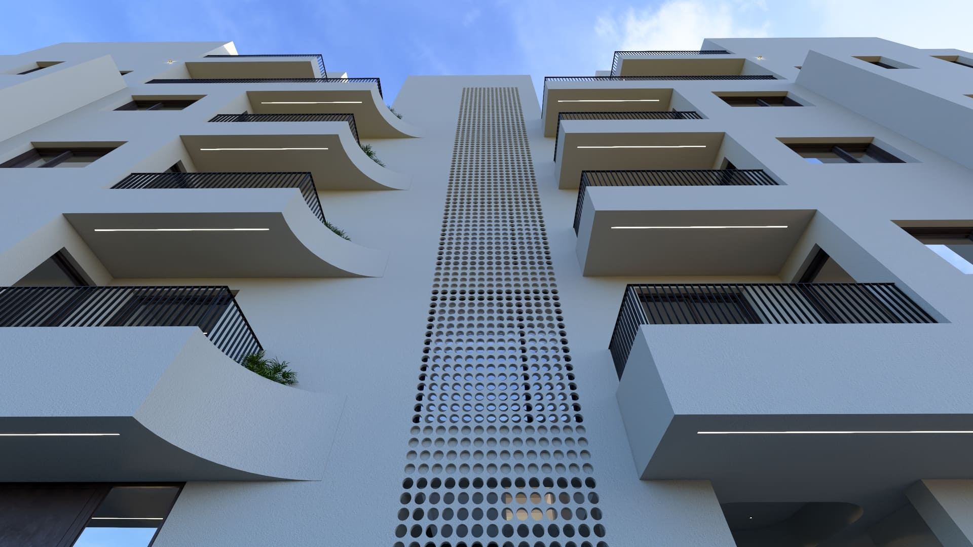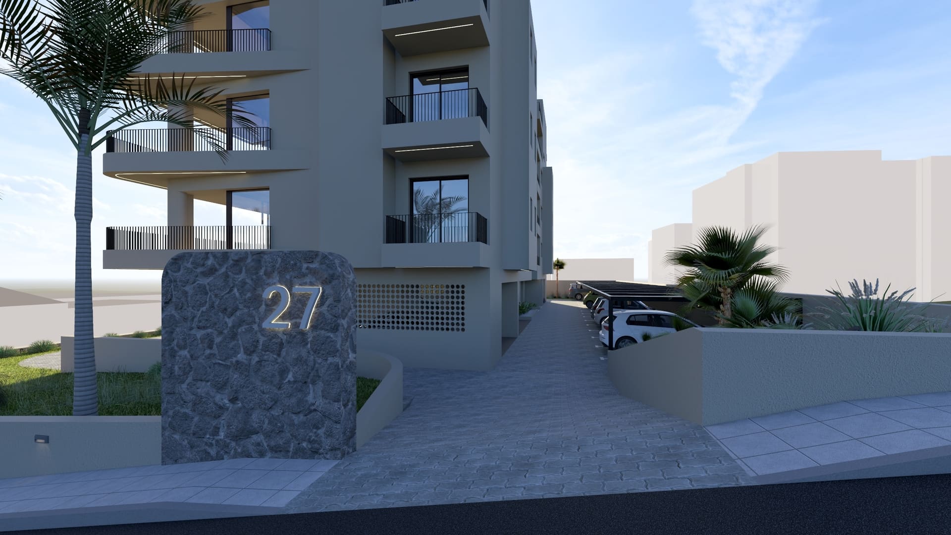 The building is positioned freely within the plot to maximize natural lighting and ventilation, ensuring that all apartments are cross-ventilated. The surrounding landscape is carefully designed to increase green areas and provide 23 parking spaces, addressing a key urban challenge in Chania. Architecturally, the building adopts a monolithic aesthetic with soft sculptural gestures. Curved balconies and projections define the façades, softening the volume and giving it a dynamic yet balanced form. A unified beige tone envelops the structure, complemented by vertical dark-gray metal railings and aluminum frames, emphasizing a restrained and contemporary character. Secondary façades and openings are treated with light screening elements in wood or PVC panels, maintaining privacy and uniformity.