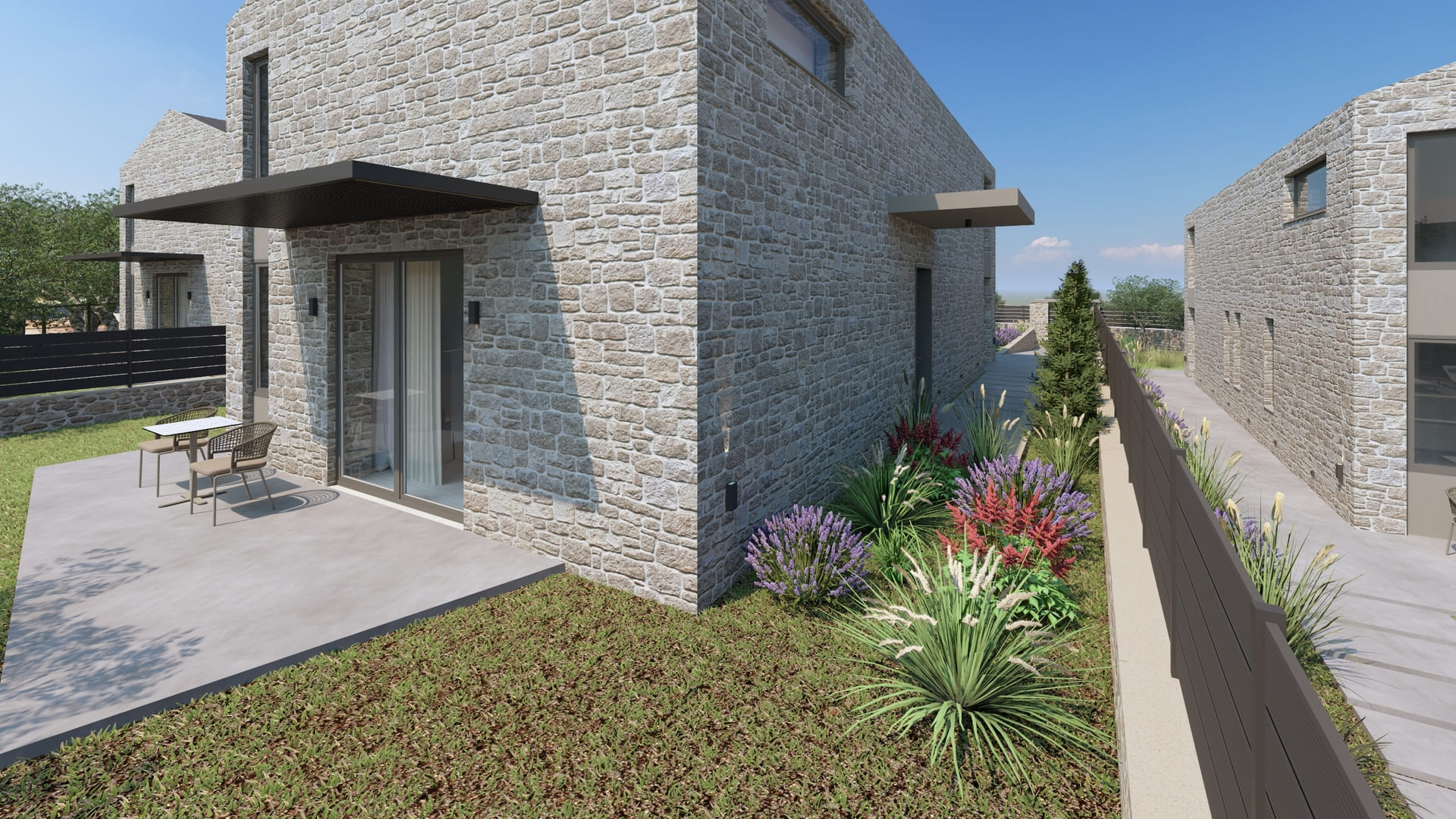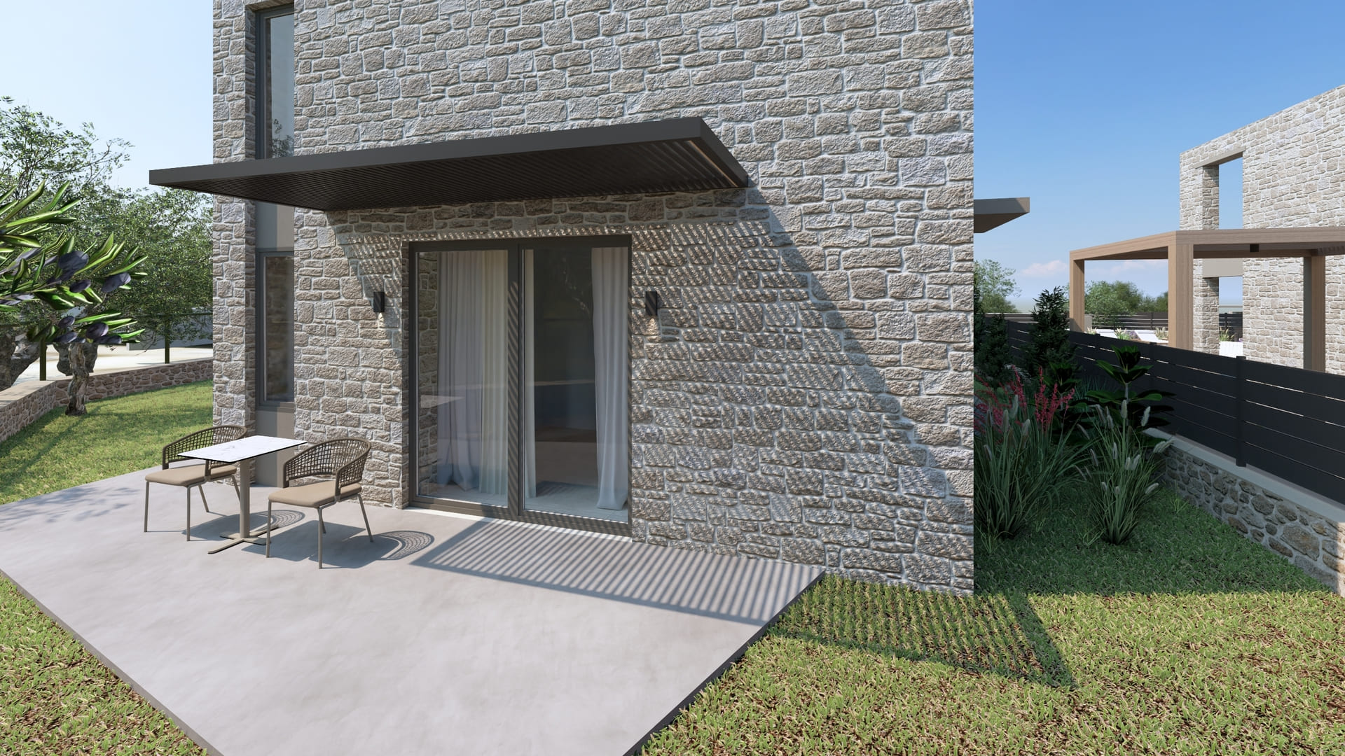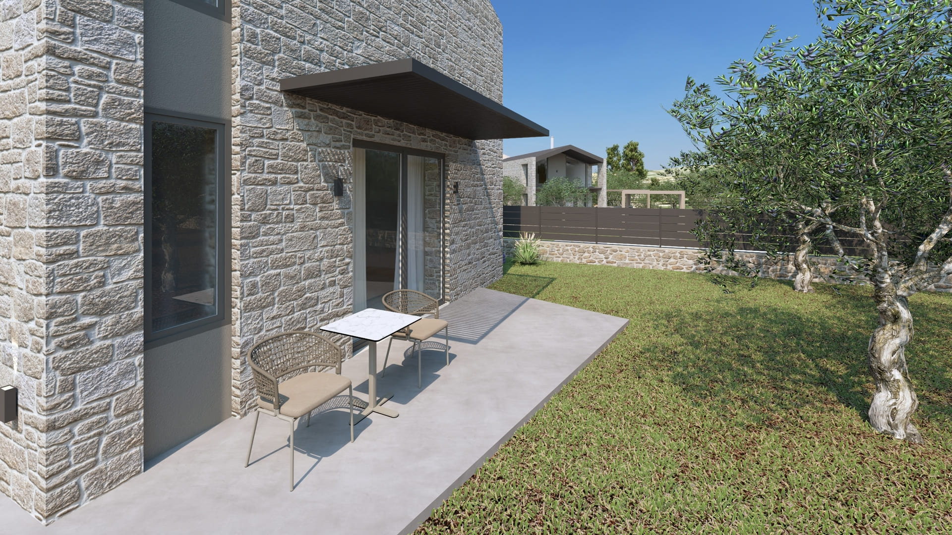 Each dwelling follows a clear and compact geometry, echoing the simplicity of traditional village façades. The design emphasizes proportion, rhythm, and the balance between solidity and openness. Interior spaces are organized on a single level, extending naturally toward shaded verandas and private courtyards. The attic level offers additional private rooms, while each residence enjoys its own outdoor area with a swimming pool and seating terrace.