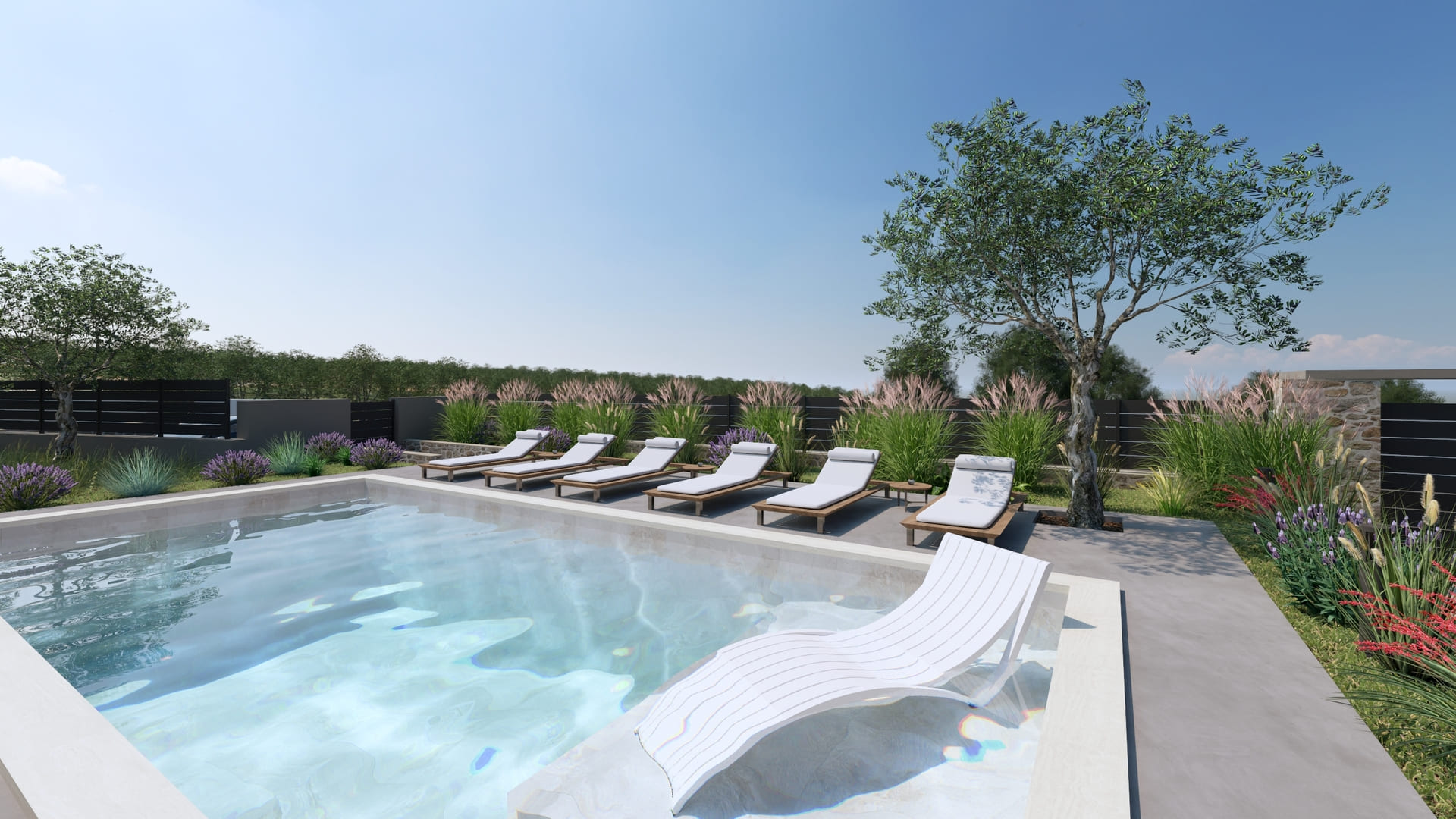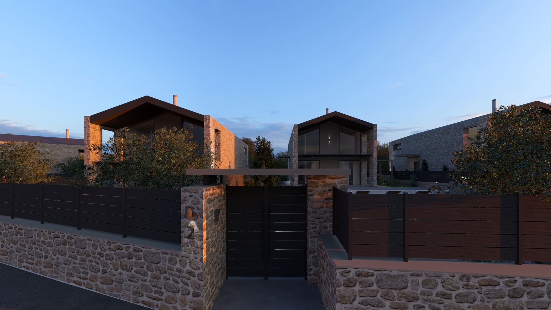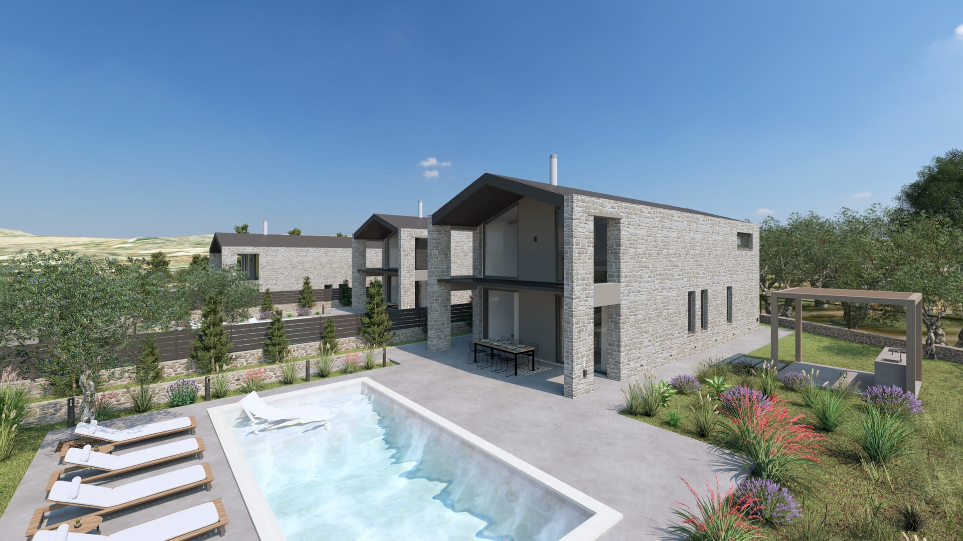 Each dwelling follows a clear and compact geometry, echoing the simplicity of traditional village façades. The design emphasizes proportion, rhythm, and the balance between solidity and openness. Interior spaces are organized on a single level, extending naturally toward shaded verandas and private courtyards. The attic level offers additional private rooms, while each residence enjoys its own outdoor area with a swimming pool and seating terrace.