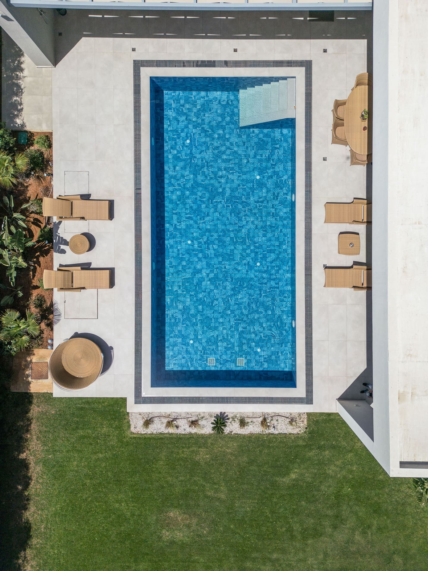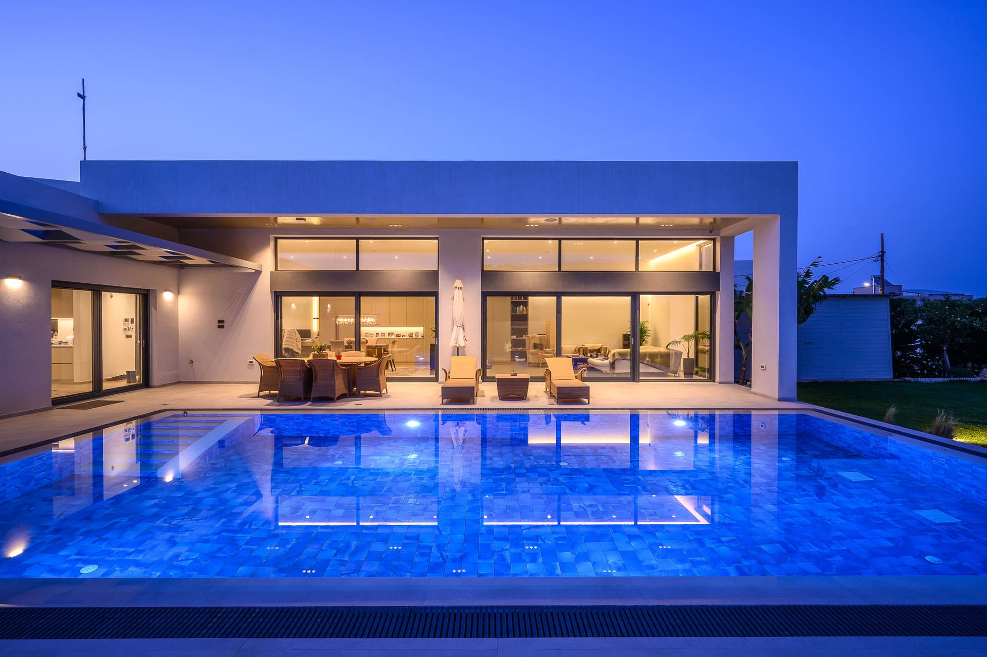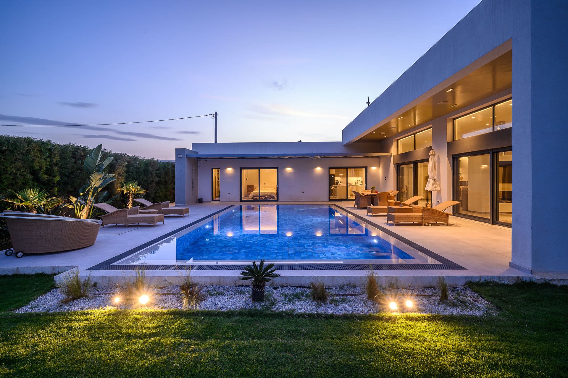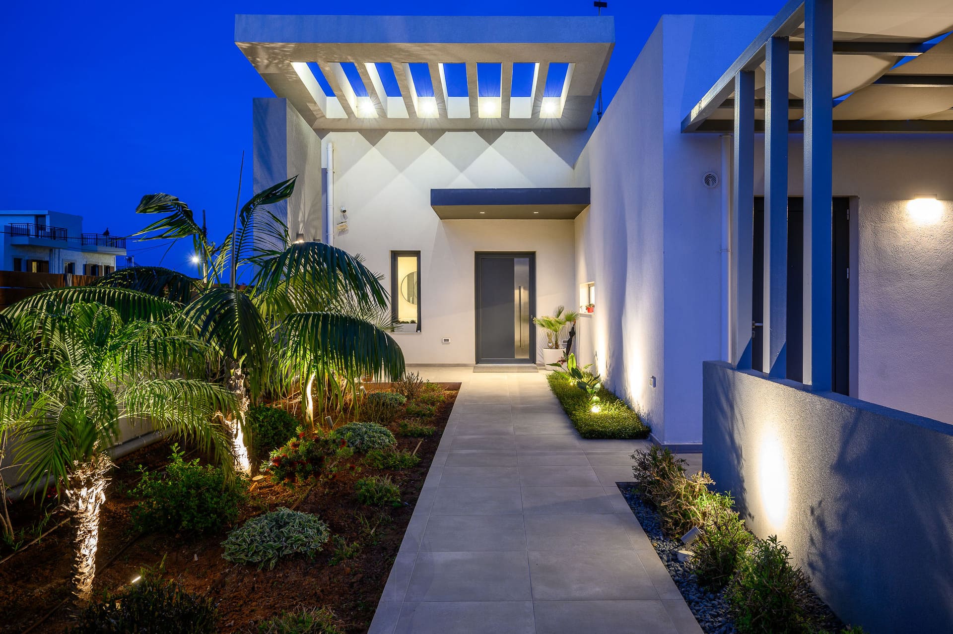 The facade showcases a harmonious play of white and gray thermal insulation paste, applied with precision to decorative recesses that complement the well-placed openings. Adding to the design's allure, two aluminum pergolas, one in the parking area and another adorning the outdoor space adjacent to the main bedroom and kitchen, introduce an anthracite hue that seamlessly integrates with the window frames. Further enhancing the architectural narrative, the semi-outdoor space in the living room features a warm touch of wood on the ceiling, while select facades are adorned with large ceramic tiles. This meticulous blend of materials and design elements creates a visually captivating and timeless aesthetic for the Kokkini Chani villa, embodying a harmonious fusion of form and function.